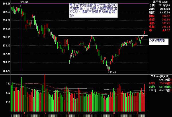 3.電子類我說過會是帶大盤過高的主要類股,目前電子指數撐點在279.88,撐點不破滿足有機會看299。