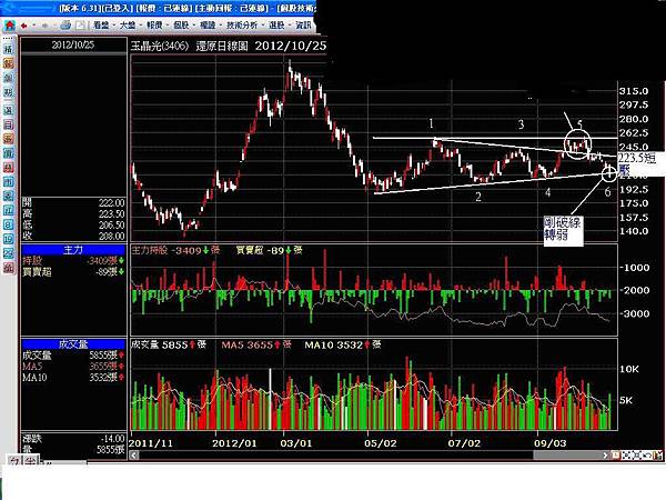 5.今天類股破底的股票,全部在我之前說的電子,包括LED,我說過一線股崩後,2線股一定崩跌,2線LED大都全部破底,另外太陽能也一樣,準破底類股,其它如2402毅嘉等,都是準備破底的股票。我們今天看一檔之前常說的業績爛股3406玉晶光,它今天剛剛破線轉弱,之前在卷資比高下,展開一波反彈,但我說過股價最終還是要回歸基本面,它前波是突破壓縮3角,型態上已經變成一***,*************************************,但它今天已經有短破線,今天高點223.5必須突破,它才有**最後反彈,目前短壓223.5,大壓力在238.5,站不回223.5轉弱就確定。
