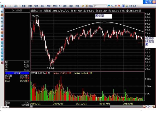 4.我們再看一檔部落貼的2347聯強(短壓58.5),這檔股一向屬於績優股,今年獲利也約3塊多,但股價確盤出一個圓型頂後連續2天重跌,站在技術面圓型底會拉*倍,相對圓型頂也會跌*成,筆者不建議在現在追空它,因為大盤位置較低了,如它未來有反彈,近壓力都可放空它。